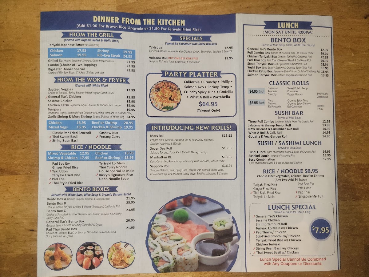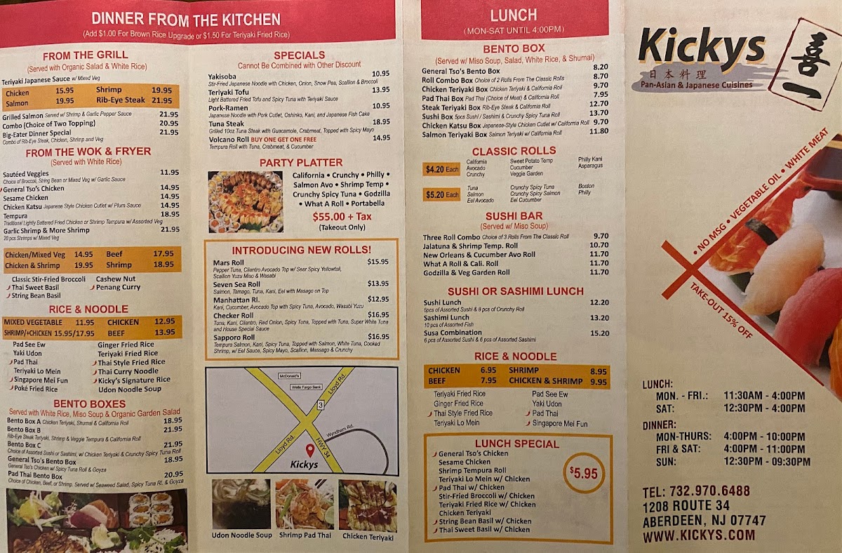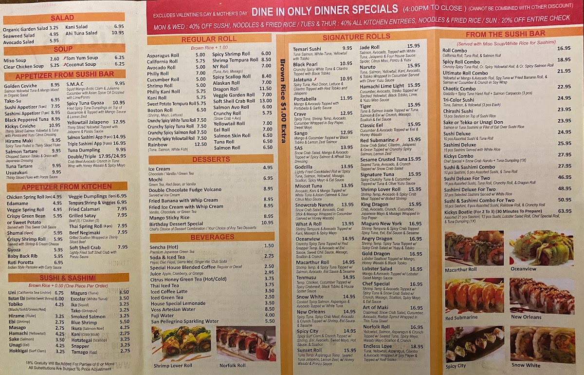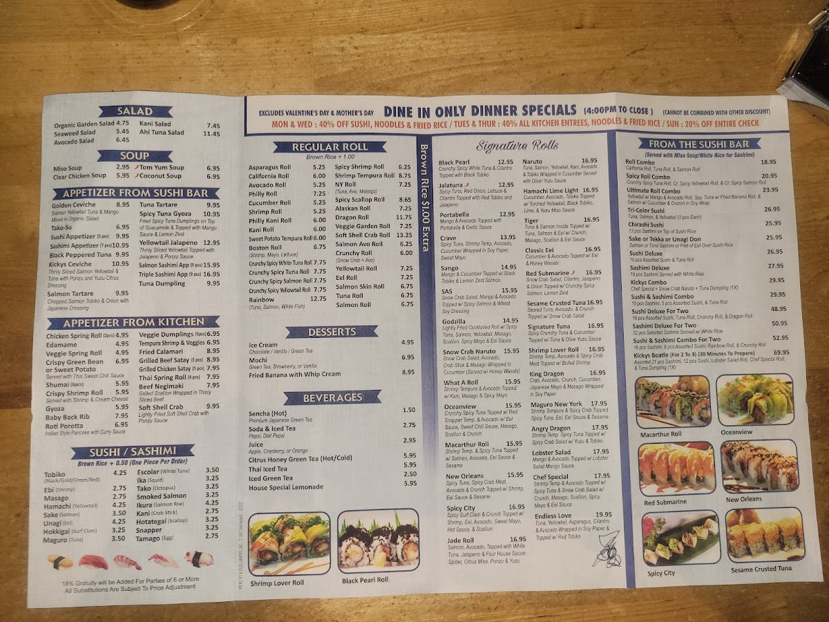 The menu at Kickys Restaurant offers a thoughtful blend of Asian and Southeast Asian flavors, bringing together casual bites and comforting dishes that suit any time of day. From delicate sushi rolls to hearty Thai noodle dishes, the selection is designed to feel approachable whether you're grabbing a quick lunch or settling in for a relaxed dinner.